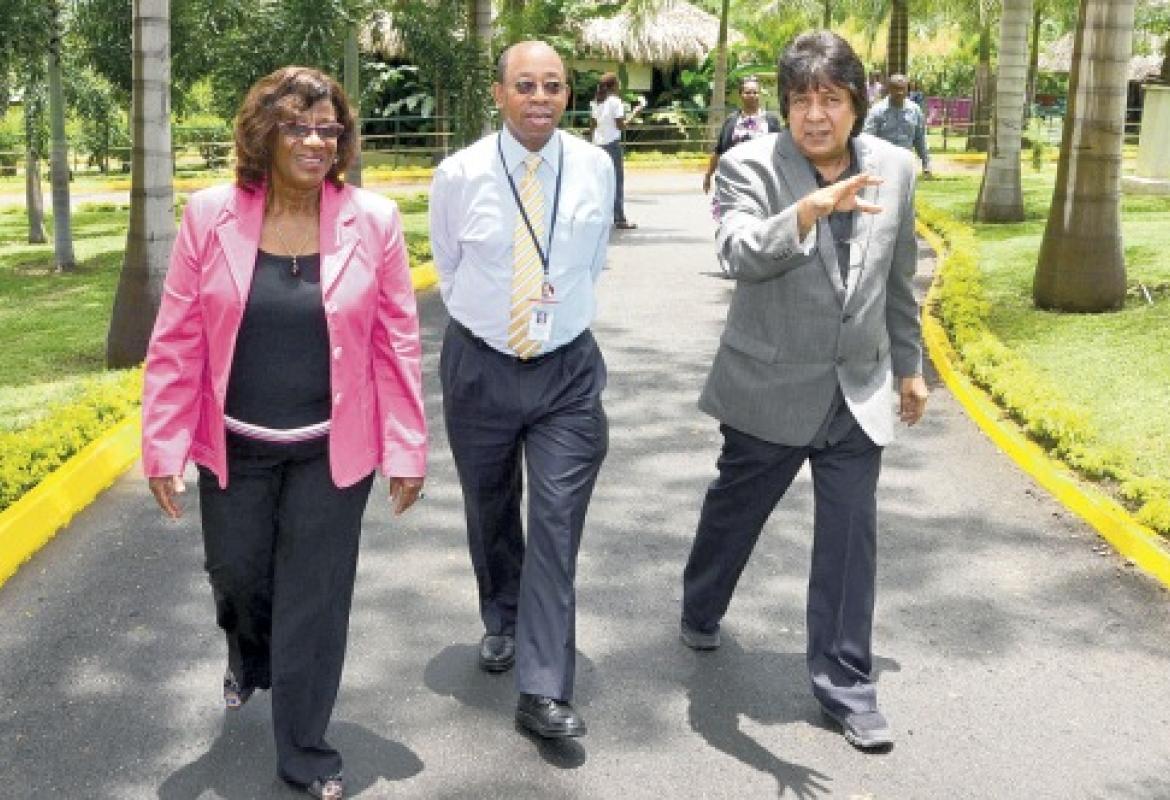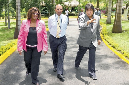 Managing director of Jamaica Social Investment Fund, Scarlette Gillings in discussion with CEO of the PetroCaribe Fund, Dr Wesley Hughes (centre), and chairman of the Hope Zoo Preservation Foundation, Kenneth Benjamin, at the closing ceremony for the Alternative Livelihoods and Skills Development Hope Zoo Landscape Training Project at the zoo's location in St Andrew.