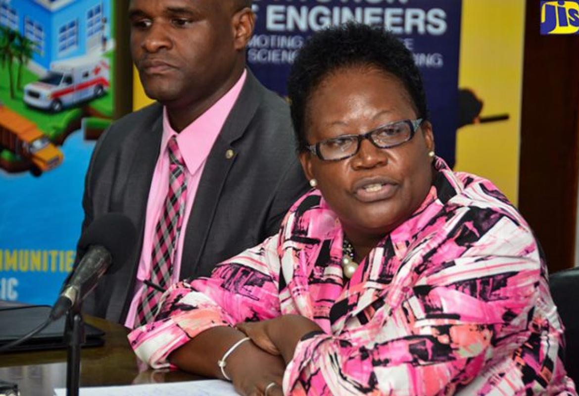 Principal, Maxfield Park Primary School, Beverley Gallimore-Vernon (right), shares the successes of her students from participating in the Jamaica Social Investment Fund (JSIF) science quiz last year. She was speaking at the recent launch of the competition at JSIF’s Oxford Road offices in Kingston. Also pictured is President, Jamaica Institution of Engineers (JIE), Dwight Ricketts.
