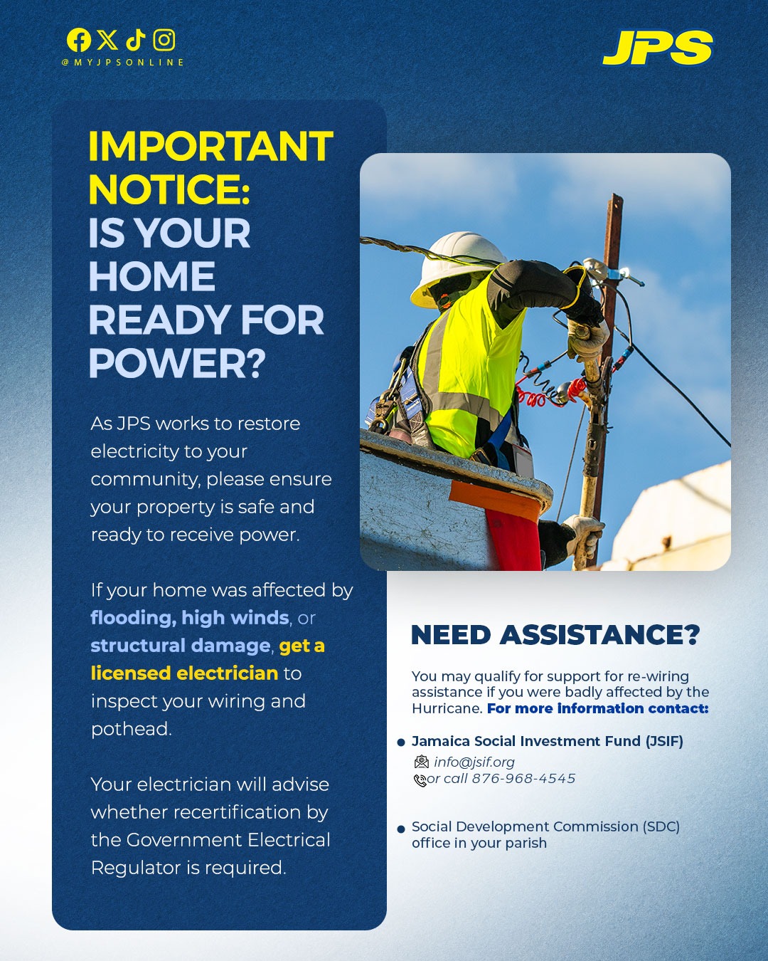 And guess what, you may qualify for re-wiring assistance. Reach out to: 📧 Jamaica Social Investment Fund (JSIF): info@jsif.org or call 876-968-4545 📍 Social Development Commission (SDC) office in your parish
